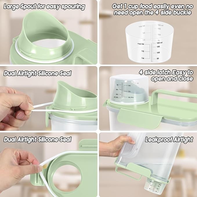 - WHAT YOU GET ? The dog food storage container comes with a 1-pack airtight pet food storage container with a clear measuring cup and an upgraded large spout for easy pouring of pet food at any time. This dog food storage containers can be a gift The perfect gift for any home.
