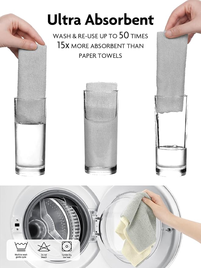- [Ultra Absorption] Tackle any mess, wet or dry. The microfiber cloths boast the ability to absorb up to 7 times their weight in water, capturing more grime and drying faster than traditional towels, all while remaining odor-free