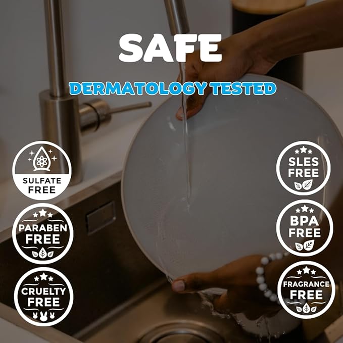 - Hypoallergenic & Skin-Safe: Formulated with organic ingredients, this non-toxic dish soap is gentle on your hands but tough on grease, ensuring your dishes are sparkling clean without harming your skin.