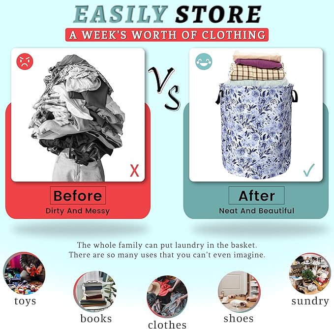 - Multipurpose:The laundry basket will be a good assistant in your life. Ideal for playrooms, bathrooms, bedrooms, cloakrooms, kitchens, offices and car cabs to store toys, clothes, office debris and household clutterng