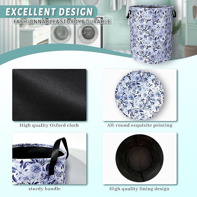 Blue Flower Floral Laundry Basket Foldable With Handles Beautiful Tote Bag Oxford Cloth Colorful Laundry Hamper Clothes Storage Bucket Toy Organizer 18.9"x16.5"For Bathroom/Laundry/Bedroom