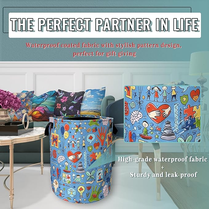 Autism Awareness Doodles Laundry Basket Foldable With Handles ColorfulTote Bag Oxford Cloth Funny Laundry Hamper Clothe Storage Bucket Toy Organizer 18.9"x16.5"For Bathroom/Laundry/Bedroom