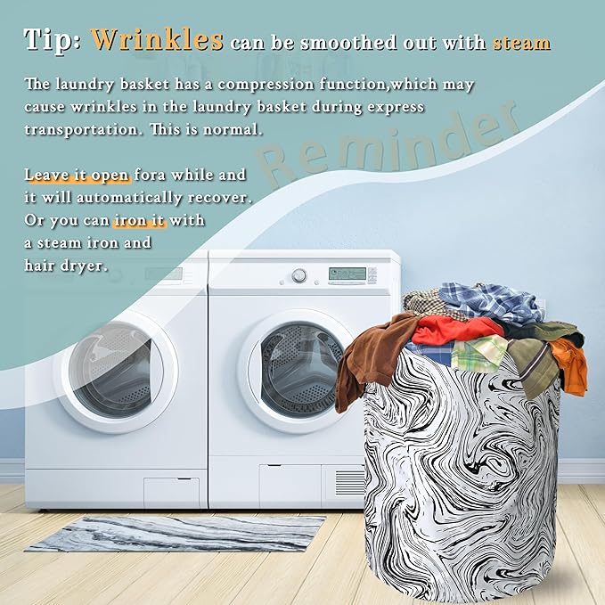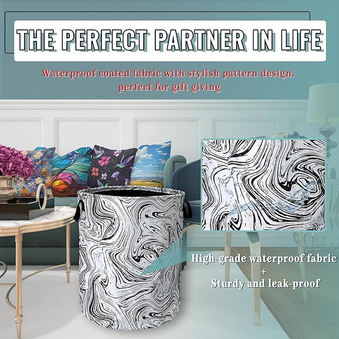 Black and White Marble Texture Laundry Basket Foldable With Handles Tote Bag Oxford Cloth Funny Laundry Hamper Clothes Storage Bucket Toy Organizer 18.9"x16.5"For Bathroom/Laundry/Bedroom