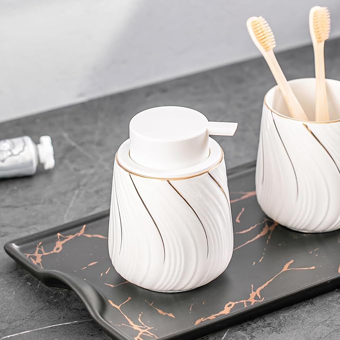 Foam Hand Soap Dispenser - 13.5 oz Ceramic foaming Hand soap Dispenser with Easy-to-Press Pump for Bathroom refillable Liquid Hand soap Dispenser (Foam-White with Gold Thread)