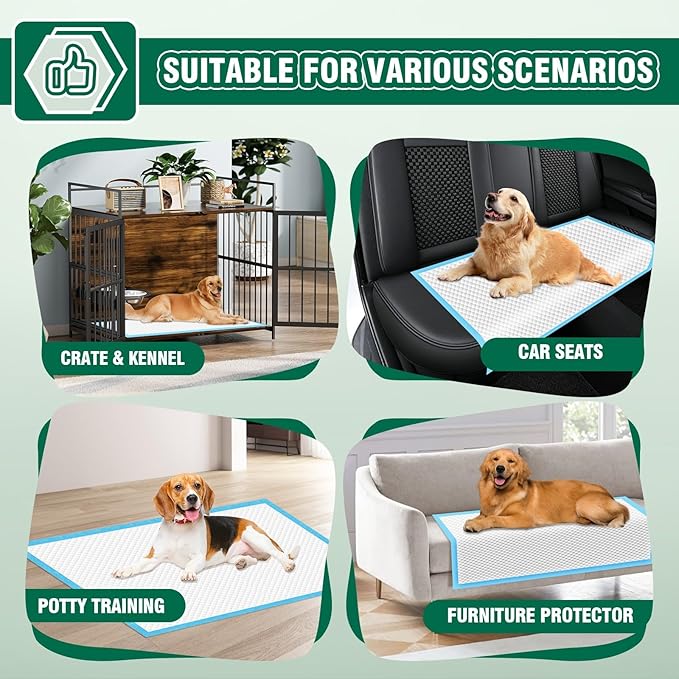 - Versatile and Convenient: Our xl puppy pads are not just for puppies. They can also be used by adult dogs and even as adult pee pads for humans. Perfect for housebreaking, crate training, or providing a comfortable surface for pets with medical conditions. These disposable dog pee pads are the ultimate solution for all your pet's needs