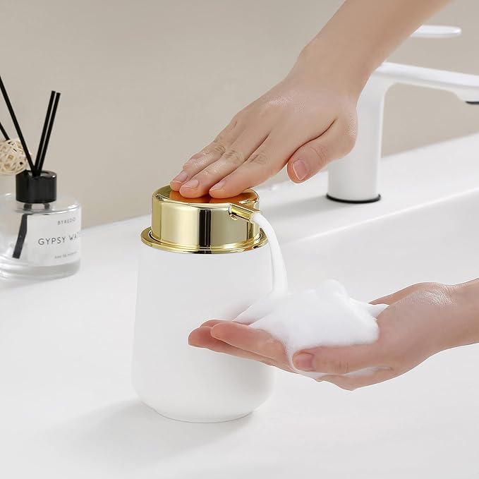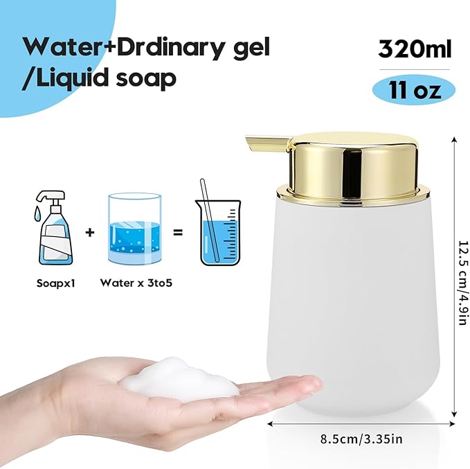Matte White and Gold Foaming Hand Soap Dispenser Plastic 11 oz - Modern Luxury Style for Bathroom & Kitchen Countertop Refillable