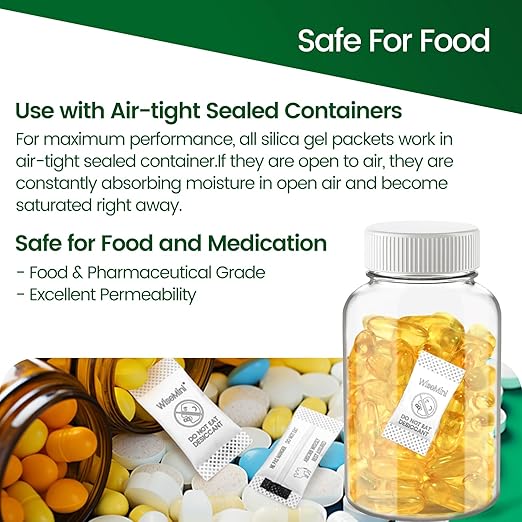 - Food Safe: Place your items and silica gel packets in a tightly sealed container to protect your items from moisture damage; Use silica gel packs to protect Foods, Medications, Vitamins, Seeds, Nuts, Snacks, Cookies, Spices, Pet Foods, Collectables, Jewelry, Documents, Camera Lens, Clothes, Cosmetics, Books, Bags, Decorations, Wet phones, Cameras, Watches, Electronics, Shoes, and Many Other Valuables.