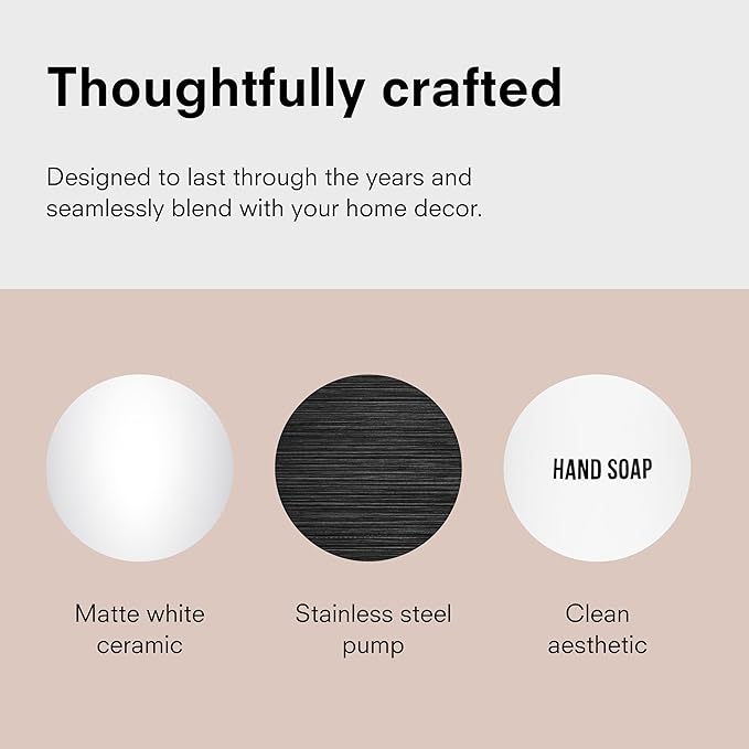 - Clean and Modern - Designed to blend seamlessly with the rest of your home decor, our matte white ceramic soap dispenser is simple in both appearance and function.