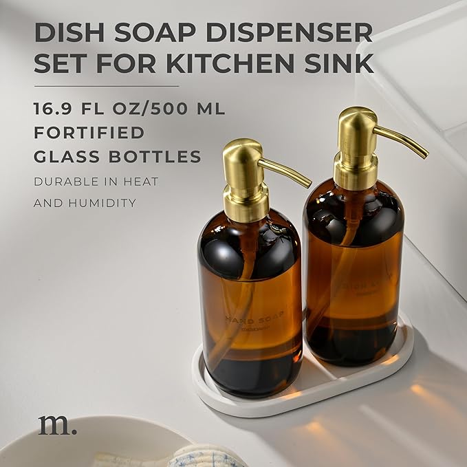 - This Pack Includes: Two amber glass soap dispensers with gold stainless steel pumps, which can hold 16.9 fl oz/500 ml, an oval concrete tray, and durable waterproof labels (hand soap, sanitizer, dish soap, lotion), ensuring both style and practicality for your bathroom sink.