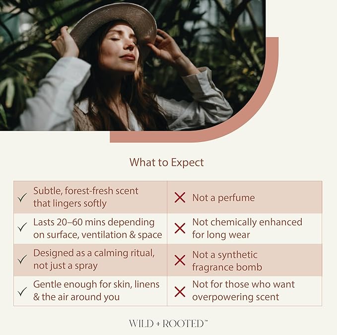 - Ritual-Worthy Scent Experience: Turn everyday moments into mini rituals. Mist in your shower, on your pillow, clothing, or workspace to invite in calm, clarity, and a subtle forest-spa vibe.