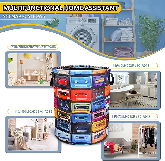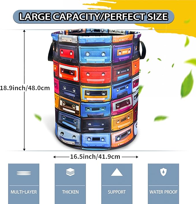 Vintage Cassette Music Tape Laundry Basket Foldable Oxford Cloth Funny Tote Bag Laundry Hamper Clothes Storage Bucket Toy Organizer For Bathroom/Laundry Storage/Bedroom 18.9x16.5 Inch