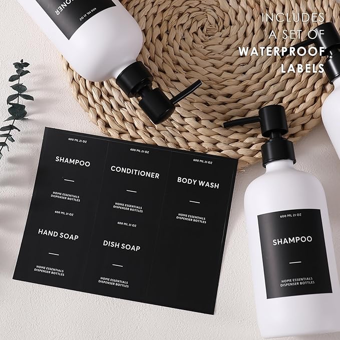 - BATHROOM SHOWER DISPENSER SET OF 3 - The Bathroom dispenser set contains 3-Pack 21oz(600ml) white bottles, 3 black pumps, 5 waterproof black labels(“SHAMPOO”, “CONDITIONER”, "BODY WASH", "HAND SOAP", "DISH SOAP"), the pump bottles for shampoo and conditioner are instantly help to organize your bathroom, Perfect Bathroom Essentials for home or hospitality.