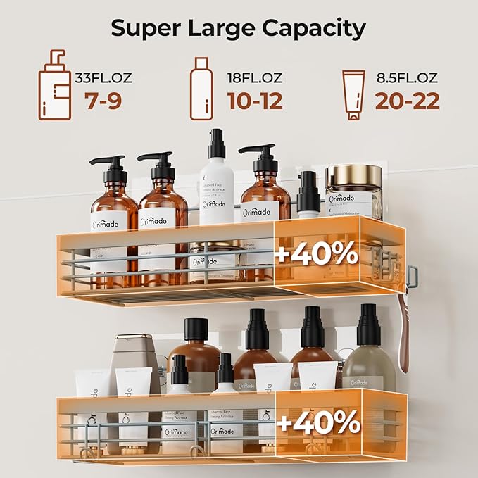 - Strong Adhesive: Orimade shower organizer is made of nano material and has powerful adhesiveness. No drilling and damage to the wall. Just stick the adhesive on the surface and install the shelf on it. If you need to move install place, you can search B07KF7RWG9 and purchase more adhesives. NOTE: DO NOT stick the adhesive strip on painted walls or wallpapers as it will take off your paint or wallpapers.