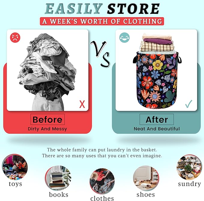 - Multipurpose:The laundry basket will be a good assistant in your life. Ideal for playrooms, bathrooms, bedrooms, cloakrooms, kitchens, offices and car cabs to store toys, clothes, office debris and household clutterng