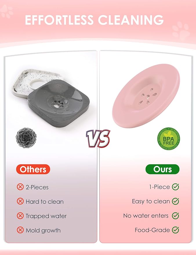 - 【One Piece Molded Floating Disk】Besides lid, the bowl also goes with a floating disk to slow down water drinking, also helps prevent dust, dirt, and pet hair from falling into the water. What’s more, it is an upgraded one piece molded floating disk, no water seepage, never get moldy or dirty, no need to pry open for cleaning.