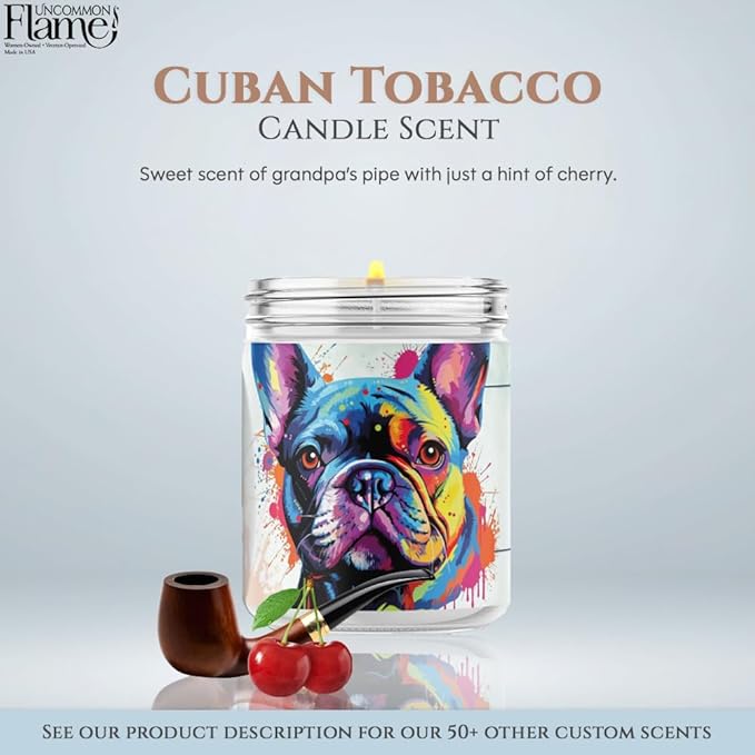 100% Handmade Non-toxic Soy Wax Candle, Warm Scent, 120hr Burn, Soot Free, Cotton Wick, 16 oz - Gift for Dog Moms & Dads, French Bulldog Lovers (Frenchie, Cuban Tobacco)