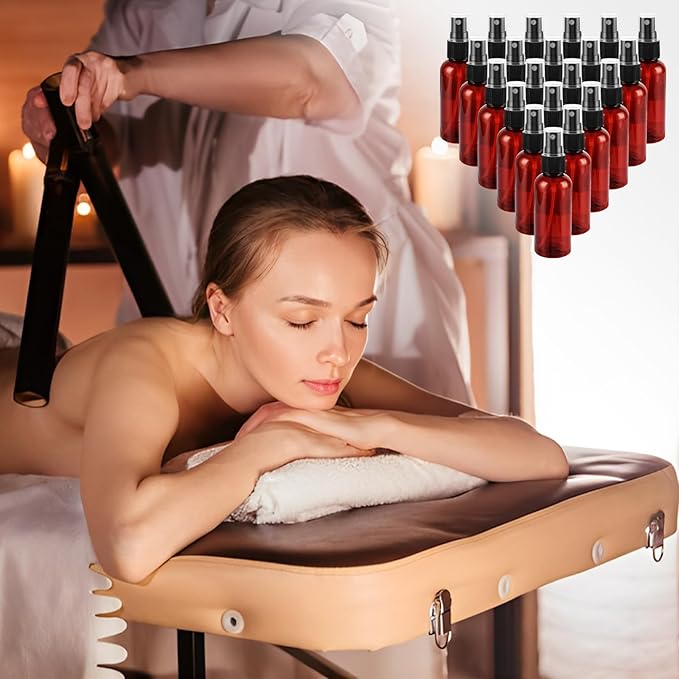 60PCS 2 oz Plastic Amber Spray Bottle, Empty Small Amber Spray Bottle with Sticker and Funnel, Refillable Mini Mister Spray Bottles for Essential Oils, Bath & Cleaning