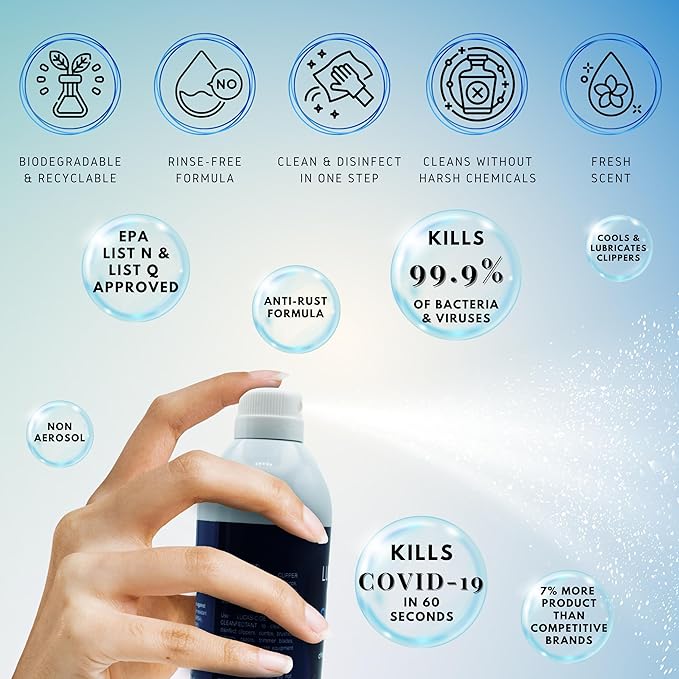 - LUCAS-CIDE clipper cleaner spray with disinfectant.