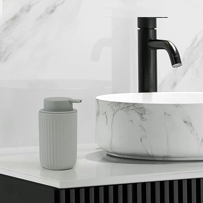 - Modern Style: Hand sanitizer dispenser with unique styling, light grey color with grey pump. It' s both functional and decorative, suitbable for bathroom, hotel, school, guest room and any decor.