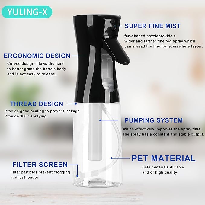 - Durable and leak free: The spray bottle adopts thickened PET plastic and enhanced sealing, which is firm and durable, not easy to sag, and effectively prevents leakage. The ergonomic shape and easy to grip handle reduce hand fatigue. Capacity: 200ml/6.8oz, length: 20cm/7.87 inches, width: 6cm/2.36 inches.