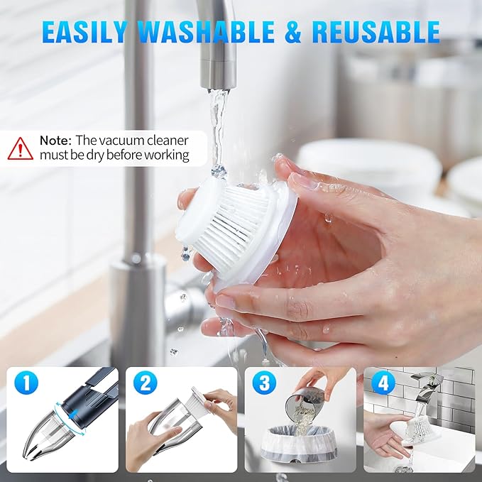 - 【WASHABLE REUSABLE FILTER】:This hand-held cordless vacuum has a high efficiency particulate air (HEPA)compatible filter with a double-snap design that can be opened immediately to empty waste or rotated to quickly remove waste. The HEPA filter has good dust absorption capacity and screening capacity and the removal rate is as high as 99.99%. Regular cleaning filters debris more effectively,protects high-speed motors and extends their availability and environmental protectio