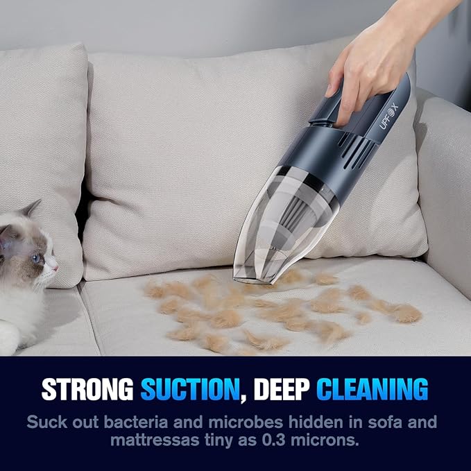 - 【HAND VACUUM CORDLESS RECHARGEABLE】: This mini vacuum cleaner has a built-in 6600mAh lithium battery, First charge it for 2-3 hours before use (the red light is on when charging, the green light is on when full) and it can run for 10-20 minutes (the running time may vary according to the cleaning load). The powerful suction makes it effortless to pull dust and debris from car seats, carpets and crevices and you can drop this portable vacuum cleaner in any storage space to start a pleasant journey with the UPFOX handheld cordless vacuum cleaner