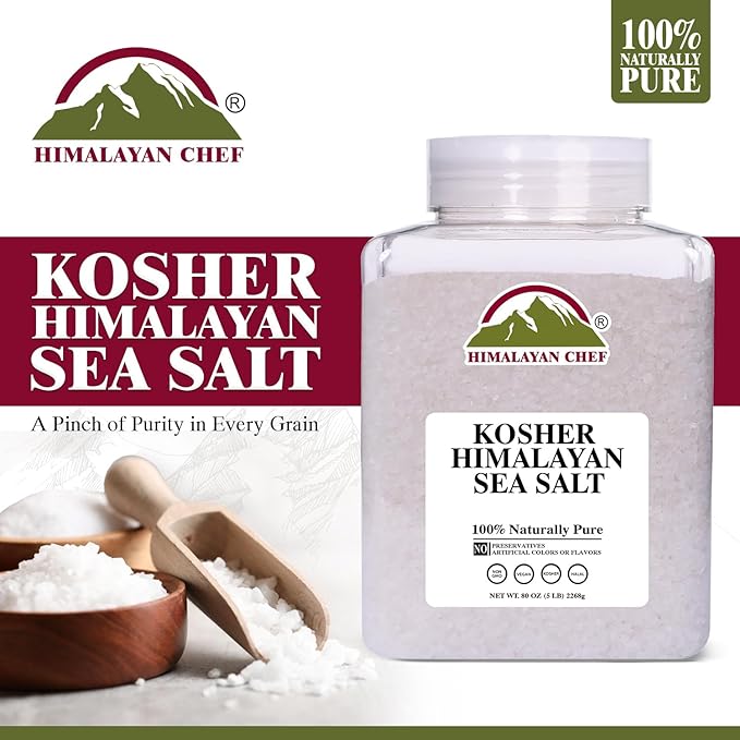 Himalayan Chef Kosher Sea Salt – Full Flavor, No Additives, unrefined and Less Sodium - Natural and Organic - 5 Pound Plastic Jar, Kosher & Non GMO Certified