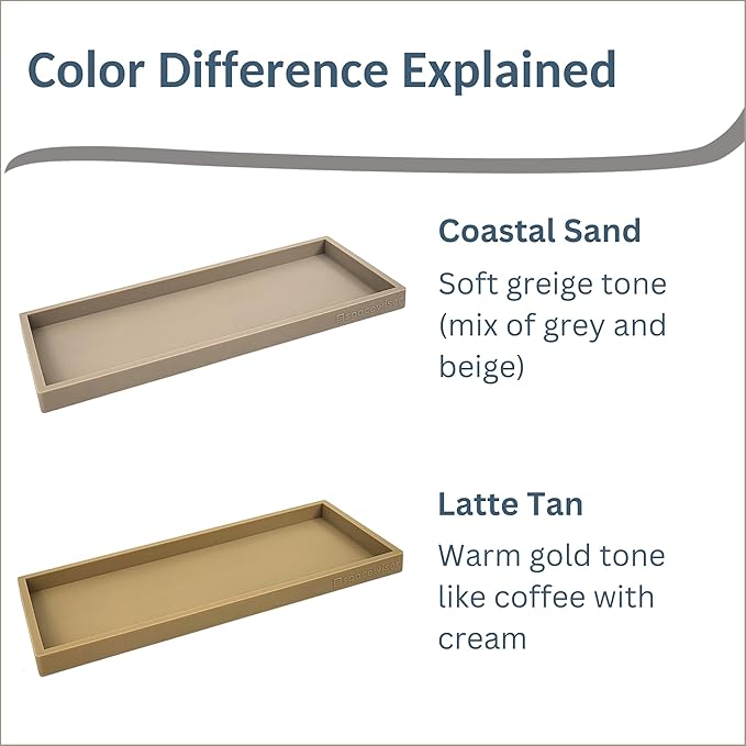 - The Details - Sized at 11.7” x 5”, and made of flexible but sturdy food grade silicone, this tray is the perfect kitchen sink tray, bathroom tray, kitchen counter tray or bathroom sink organizer. It’s an ideal dish soap holder for kitchen sink areas or soap dispenser tray. The Coastal Sand color is perfectly neutral and matches coastal, beach, earthy, beige and nature design aesthetics.
