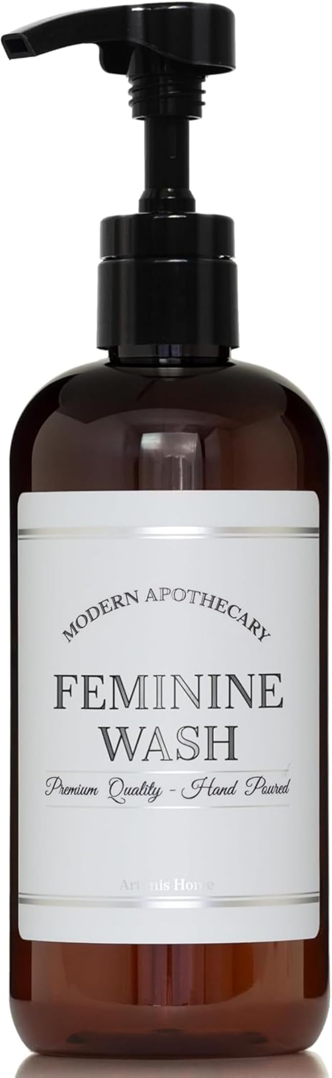 Refillable Amber PET Plastic 16 oz Feminine Wash Bottle with High Output Black Plastic Pump Dispenser - Chrome Accent Waterproof Labeled Bottle