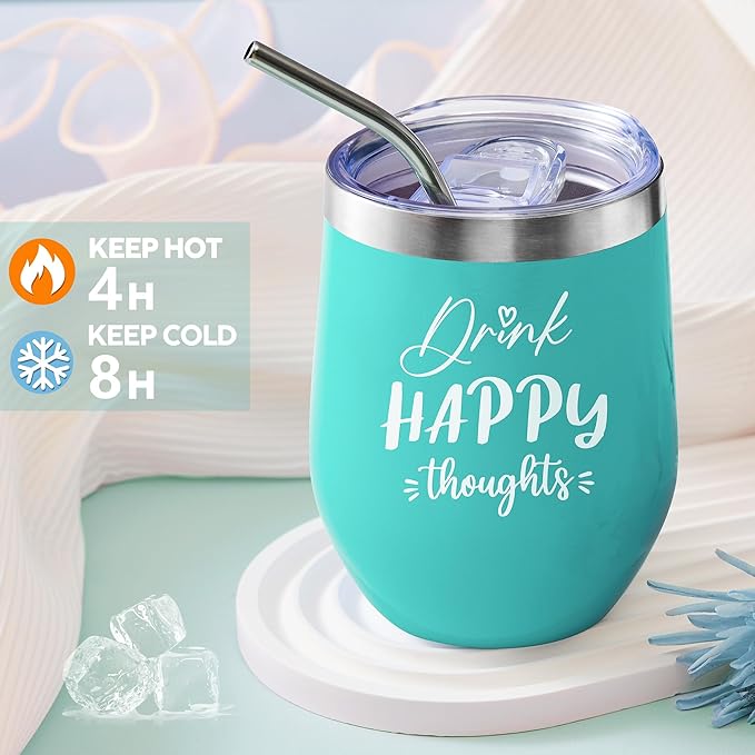 - THOUGHTFUL INSULATED VACUUM TUMBLER GIFT SET: Crafted from 18/8 food-grade stainless steel with double-walled vacuum insulation, this sweat-free 12oz insulated tumbler keeps drinks hot for 6 hours and cold for 9 hours. The motivational quote, "Drink Happy Thoughts," will brighten her day as she enjoys coffee, tea, or wine—making it an ideal relaxation gift for best friends mom sister, daughter, grandma, wife, girlfriend, coworkers teacher