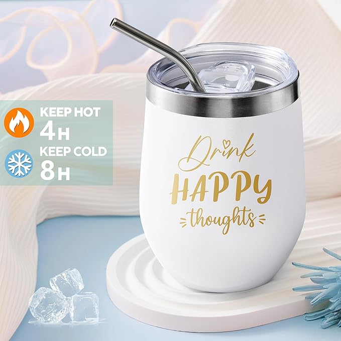 - THOUGHTFUL INSULATED VACUUM TUMBLER GIFT SET: Crafted from 18/8 food-grade stainless steel with double-walled vacuum insulation, this sweat-free 12oz insulated tumbler keeps drinks hot for 6 hours and cold for 9 hours. The motivational quote, "Drink Happy Thoughts," will brighten her day as she enjoys coffee, tea, or wine—making it an ideal relaxation gift for best friends, moms, sisters, daughters, grandmas, wives, girlfriends, coworkers, and teachers