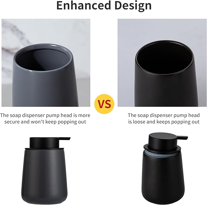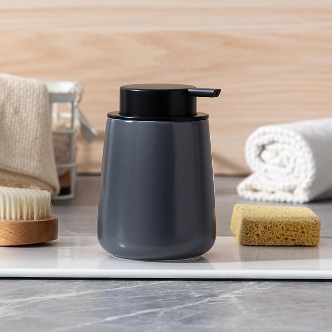- Ceramic Hand Soap Dispenser: This Grey foaming soap dispenser is crafted from high-quality ceramic for the body and premium plastic for the pump. It's lead-free, and designed for reusable convenience.