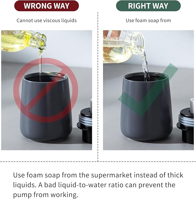 - Versatile Use: This foam soap dispenser is perfect for professional foam soap applications. (Note: Using a diluted mixture of water and liquid may damage the foam pump.) Additionally, once the pump head is removed, it can be repurposed as a water cup or toothbrush holder