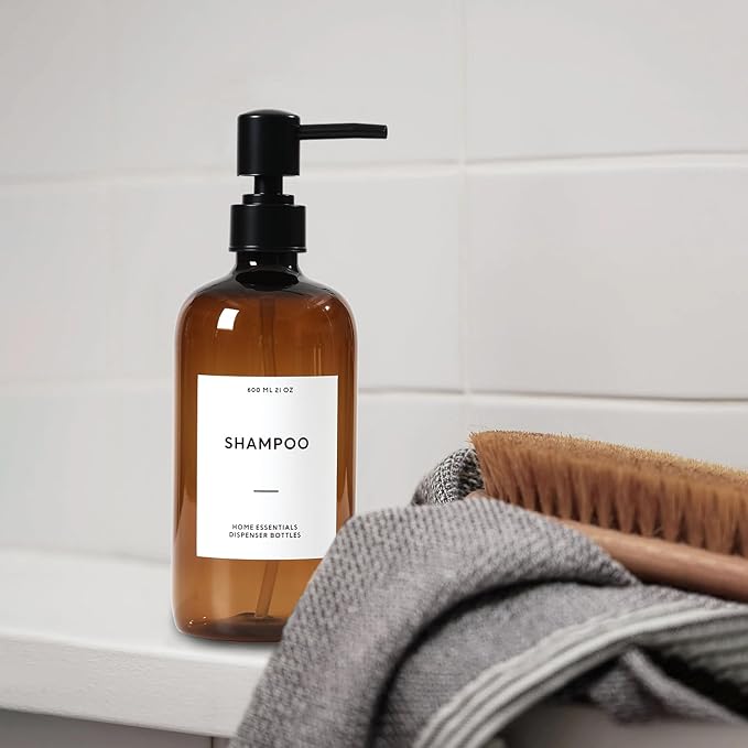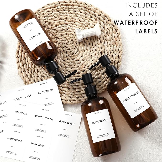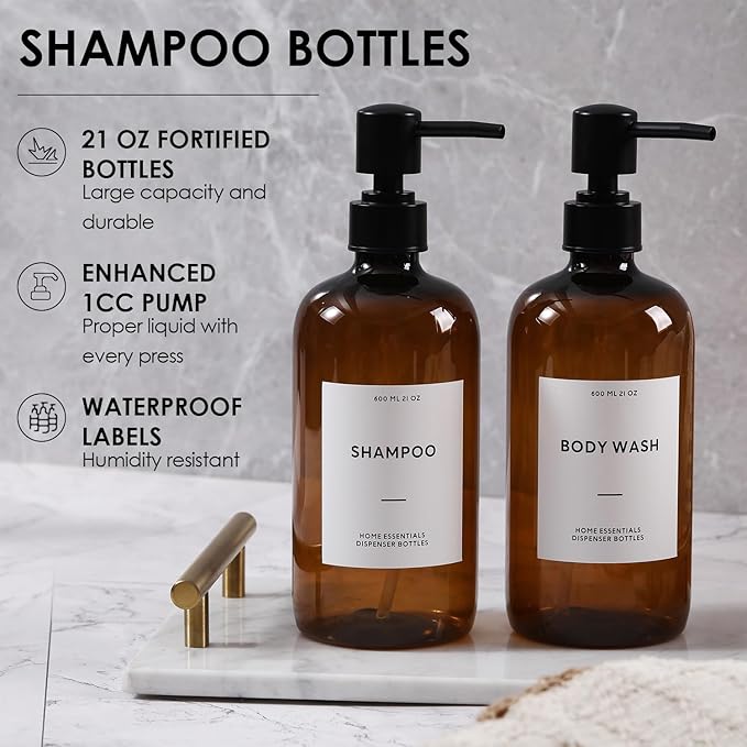 - BATHROOM SHOWER DISPENSER SET OF 3 - The Bathroom dispenser set contains 3-Pack 21oz(600ml) brown bottles, 3 black pumps, 5 waterproof white labels(“SHAMPOO”, “CONDITIONER”, "BODY WASH", "HAND SOAP", "DISH SOAP"), the pump bottles for shampoo and conditioner are instantly help to organize your bathroom, Perfect Bathroom Essentials for home or hospitality.