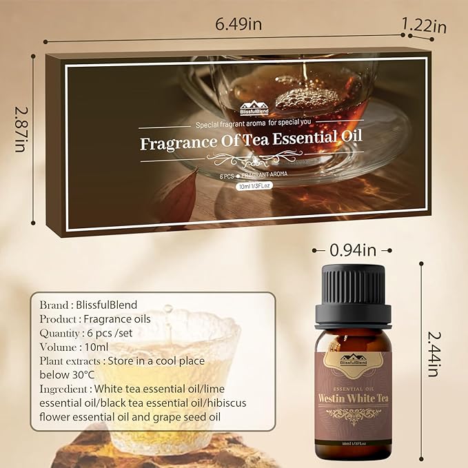 - 【Safe Ingredients】Tea essential oil set 6 kinds of popular tea essential oils are included in this set.It include Westin White Tea, Green tea, Matcha, Jasmine tea, Citron tea and Lemon tea. Each essential oil is carefully selected and its ingredients are natural and safe. It can capture the essence of natural tea fragrant flowers in the air and bring the flavor of tea essence to your daily life.