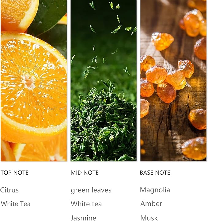 - Fragrance Oil Description: White Tea opens with the crisp purity of white tea, blooms with airy jasmine, and lingers with a whisper of warm musk—a serene and timeless scent
