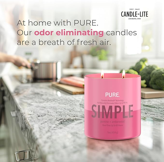 Candle-Lite Pure Jasmine & Amberwood Odor Eliminating Scented Candles, Neofresh Technology Eliminates 99.9% of Odors, 16 oz 2-Wick Jar, Proudly Poured in The USA, Up to 60 Hours Burn Time