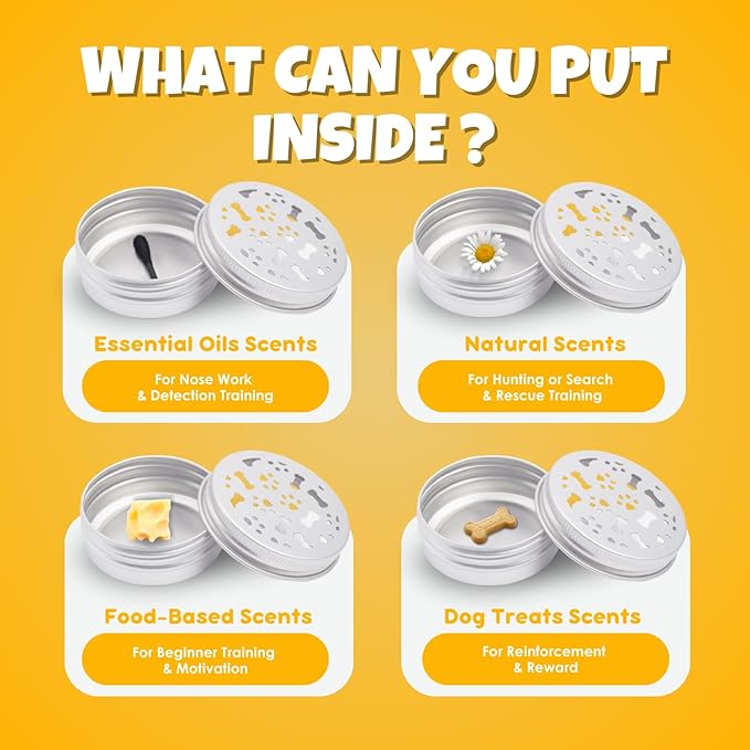- BITE-RESISTANT - Built for durability during training. Each dog scent training tin is constructed to be bite-resistant, ensuring it withstands even the most enthusiastic pups during playful scent work training. This added durability makes it ideal for canine enrichment activities where dogs may engage closely with the tins.