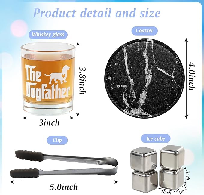 - Dog whiskey set:our 11 ounce whiskey glass made of high quality glass with "Best Dog Dad Ever" printed,the whiskey ice cubes and clip are made of safety stainless steel,the whiskey coaster handmade from PU leather,surprise your cat dad with the whiskey gift set, the ideal choice for Christmas,Father's Day or other important day to your father