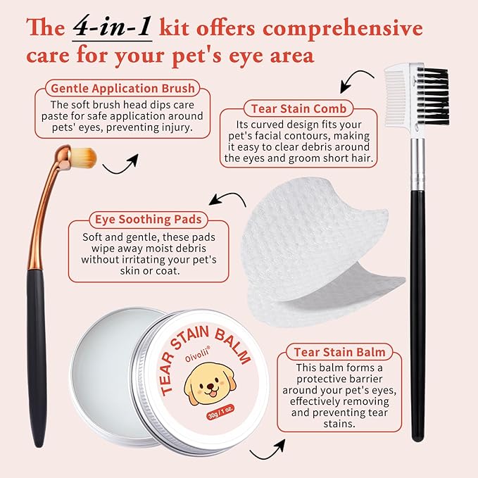 - 4-in-1 Tear Stain Remover Kit for Dogs and Cats: This tear stain remover kit includes 1 ounce of tear stain remover balm, a tear stain remover comb,a ProPowder brush,and 20 soft eye cotton pads