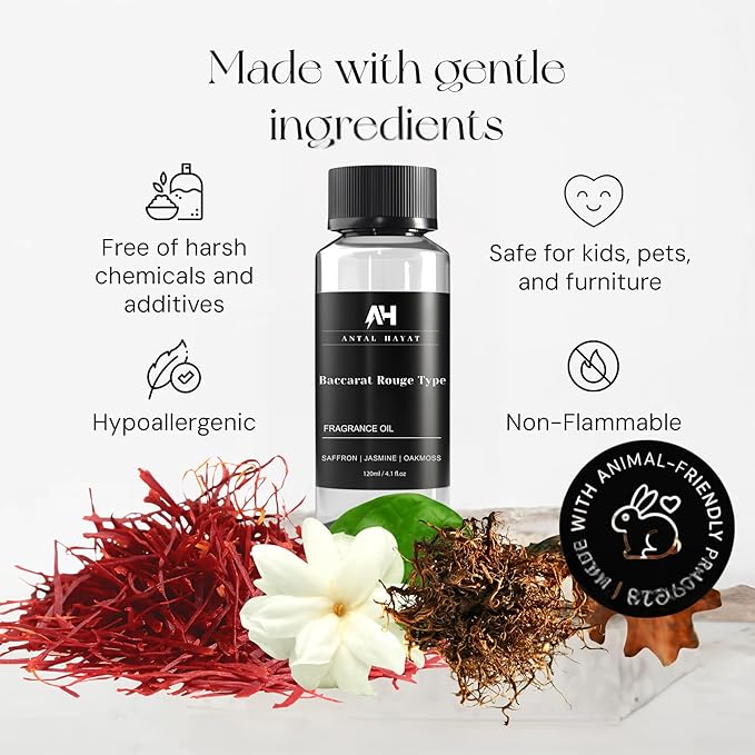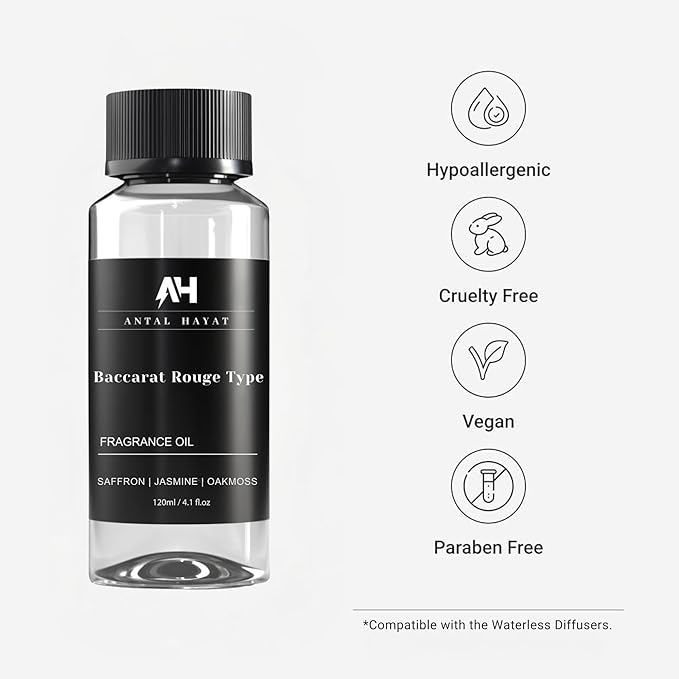 - Premium Quality and Design: Antal Hayat's Baccarat Rouge Type Diffuser Oil comes in a sleek 120ml bottle that complements the high-end fragrance it holds. Made with the finest essential oils, this product is free from harmful chemicals, ensuring a safe and eco-friendly scenting experience. Ideal for luxury lovers who appreciate refined aromas, this premium diffuser oil brings a touch of elegance and sophistication to any setting, perfect for home or professional use.