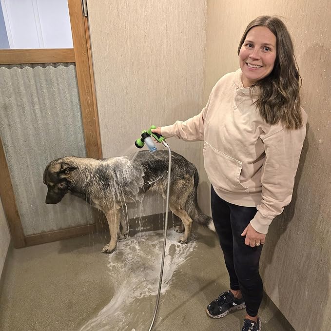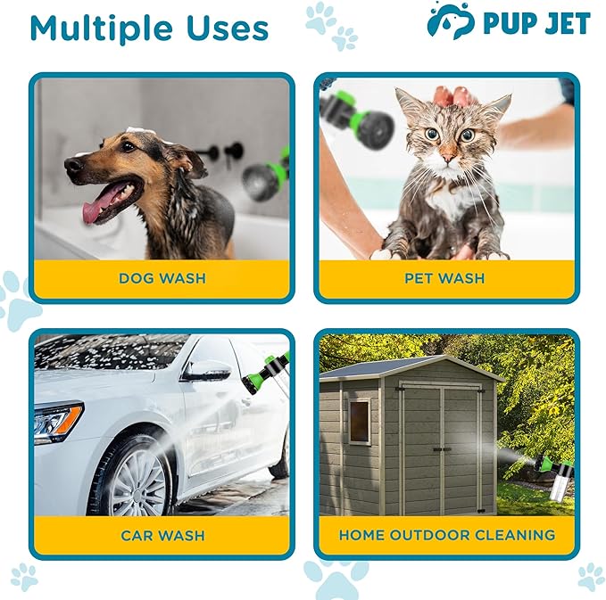 - ๐-๐ข๐ง-๐ ๐๐ฉ๐ซ๐๐ฒ ๐๐จ๐๐๐ฌ ๐๐จ๐ซ ๐๐๐ซ๐ฌ๐๐ญ๐ข๐ฅ๐ ๐๐ฅ๐๐๐ง๐ข๐ง๐ : The Pup Jet dog washing hose attachment offers 8 adjustable spray patterns including Jet, Flat, Shower, and Mist. Whether you're washing your dog, car, or garden, this dog shower attachment caters to all your cleaning needs. Customize the water flow and pressure to match your petโs comfort or tackle tougher tasks like rinsing mud off your furry friend. Suitable for outdoor use or even in the bathtub for a quick and easy pet bath.
