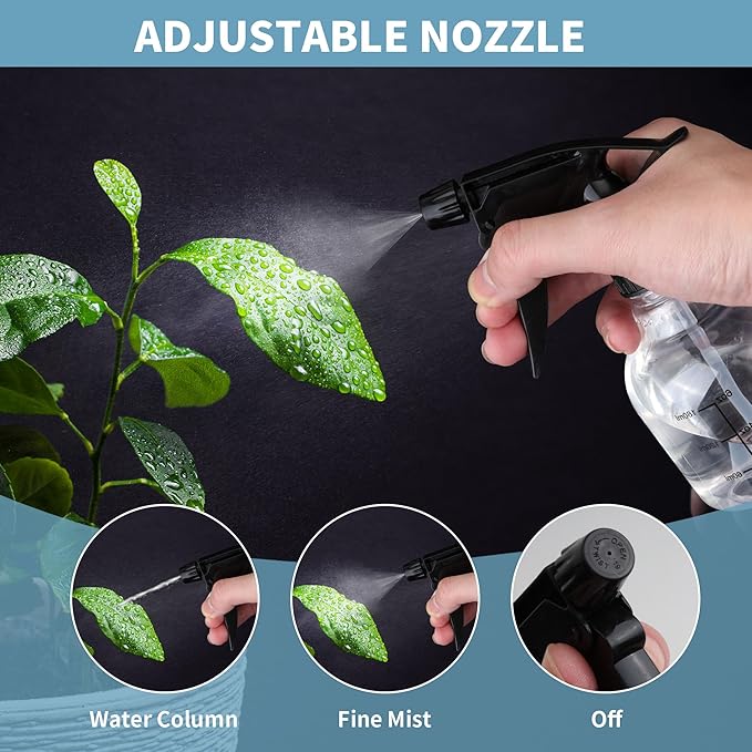 - EASY TO USE: The graduated spray bottles have an adjustable nozzle that can be controlled from a fine mist to a jet of water. Empty spray bottles are printed with 2 scales, ounces and milliliters, for your convenience in measuring