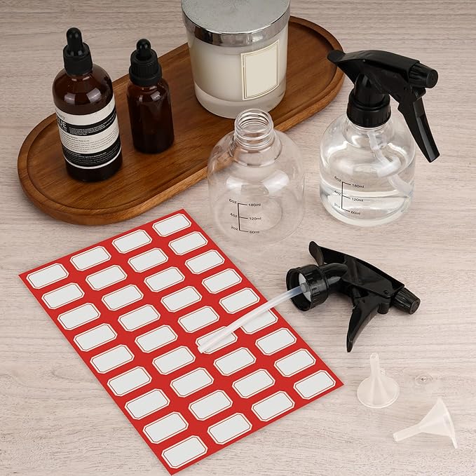 - PACKAGE INCLUDES:You will receive 24PCS spray bottles, capacity 250ml, total height 162MM, diameter 72MM, with 2 funnels and 1 sheet of 36 compartments small stickers, perfect for dispensing liquids. The stickers can distinguish your liquids