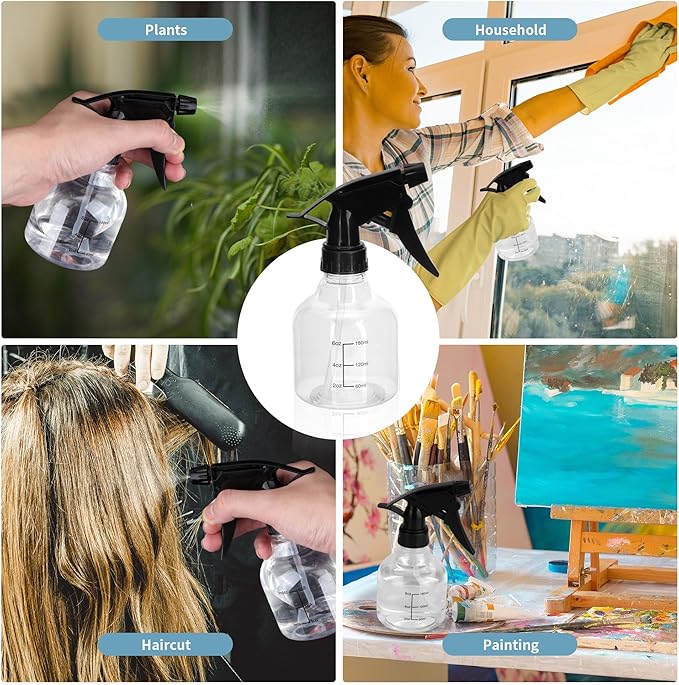 - WIDE APPLICATION: The clear spray bottle is suitable for gardening, watering flowers, home cleaning, also suitable for barber stores to store hair oils, essential oils, and can be used for hand sanitizer