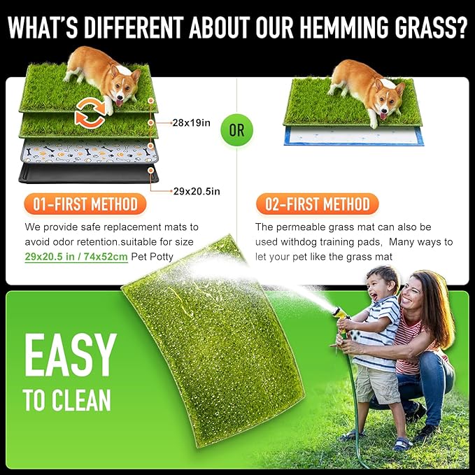 - REPLACEMENT SET】: The size of the dog grass pad is 28"×19", compatible with Hompet's pet potty tray ( 29"×20.5" ), realistic turf makes it easier to train your puppies, All training pads are hemming designed in order to prevent the turf from falling or being torn by dogs, there is no need to worry the grass mat will falling off like the other dog grass pee pads on the market and can't be used.