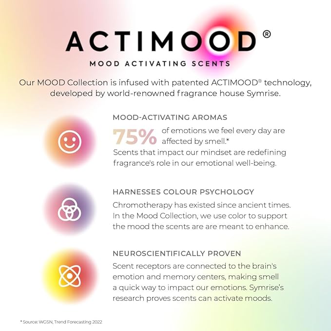 - SCIENTIFICALLY PROVEN SCENTS: The patented ACTIMOOD formula combines scent and color therapy to boost happiness, reduce stress, and enhance emotional wellbeing.