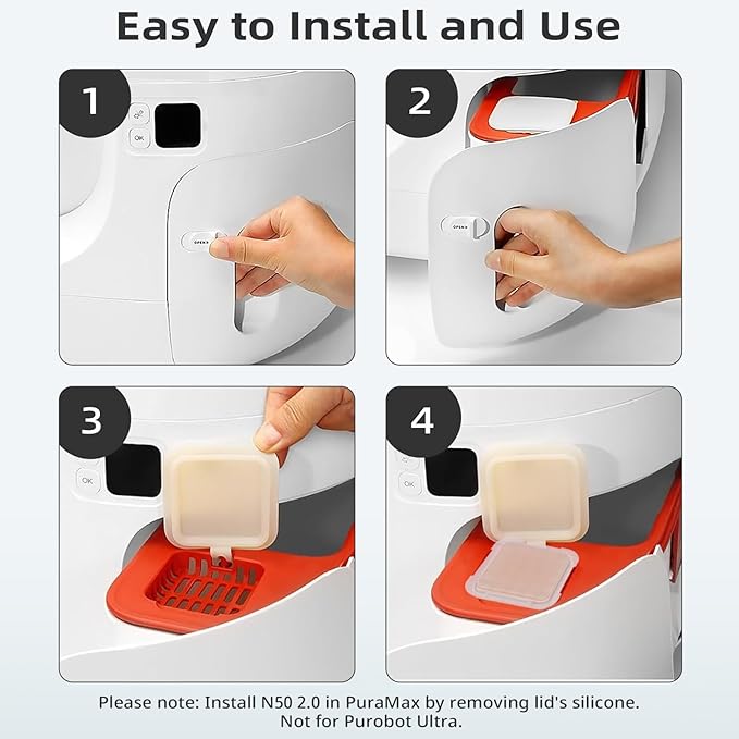 - To install the N50 2.0 in the PuraMax, please remove the silicone cover of the waste bin lid. It is not suitable for the Purobot Ultra cat litter box