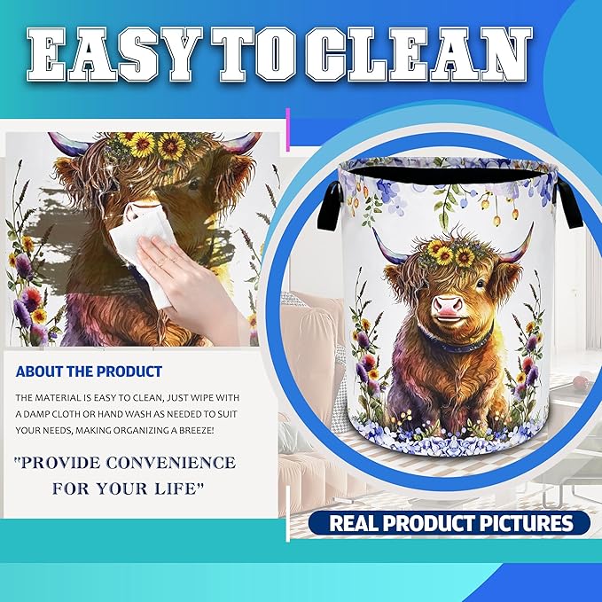 Highland Cow Laundry Basket Oxford Cloth Cattle Flowers Laundry Hamper With Handle Foldable Portable Clothes Storage Basket 18.9 X 16.5 Inch Storage Bag For Laundry Room/Bathroom/Bedroom/Dormitories