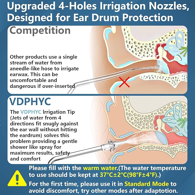 - Advanced Multiple Working Modes: The electric ear cleaner is designed with 3 different water working modes (Standard, Strengthen, Dot spray), allowing you to remove accumulated earwax from the comfort of your own home, Tips: 1)For the first time, please use it in Standard Mode to avoid discomfort, try other modes after adaptotion. 2)It is recommended to add warm water close to body temperature for optimal use, water that is too hot or too cold can cause dizziness
